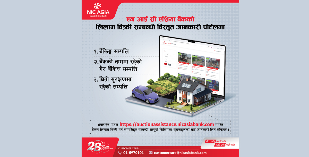 बैंकले सञ्चालनमा ल्याएको उक्त अनलाईन पोर्टलमा नियमित रुपमा बैंकिङ्ग सम्पत्ति, गैर बैंकिङ्ग सम्पत्ति तथा बैंकमा धितो सुरक्षण रही लिलाम बिक्रीमा रहेको सम्पत्तिहरु र लिलाम बिक्री सम्बन्धी अन्य सूचनाहरू प्रकाशित गरिने हुँदा खरिद गर्न इच्छुक ग्राहकहरूले अनलाईन पोर्टलको लिंक https://auctionassistance.nicasiabank.com बाटै बिक्री हुने सम्पत्तिहरुको विस्तृत विवरणहरू सहितको जानकारी लिई लाभ लिन सक्ने बैंकले जनाएको छ ।
