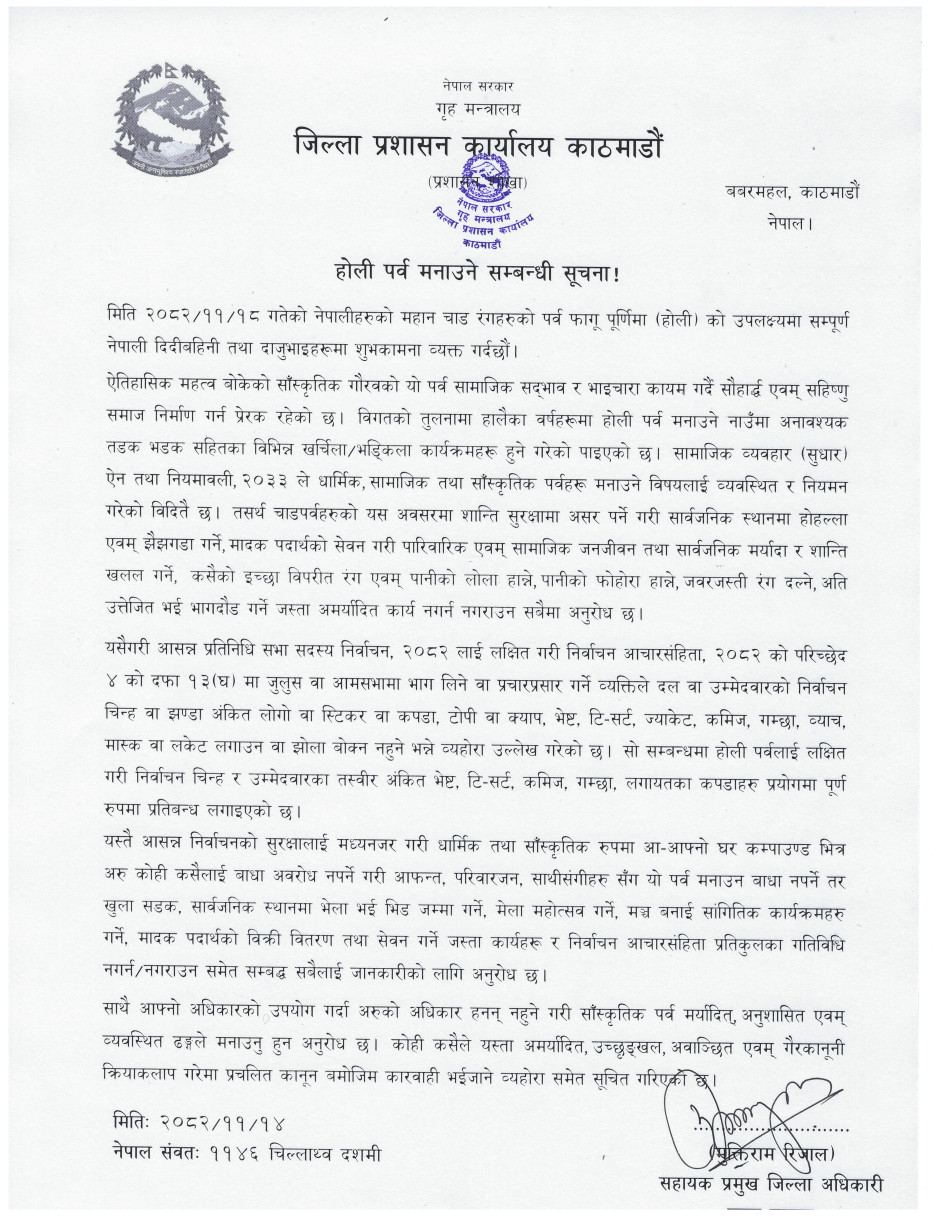 निर्वाचनको आचारसंहिता र सुरक्षा संवेदनशीलतालाई ध्यानमा राख्दै यस वर्ष होलीमा कडा प्रतिबन्ध लागू गरिएको प्रशासनले जनाएको छ। सहायक प्रमुख जिल्ला अधिकारी मुक्तिराम रिजालद्वारा हस्ताक्षरित सूचनाअनुसार सार्वजनिक स्थानमा होहल्ला, झै–झगडा तथा मादक पदार्थ सेवन गरी सार्वजनिक मर्यादा भंग गर्ने कार्य नगर्न चेतावनी दिइएको छ।