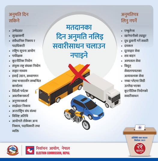 काठमाडौं । फागुन २१ गतेका लागि तोकिएको निर्वाचन अब चार दिन मात्र बाँकी छ । निर्वाचन आयोगले प्रतिनिधिसभा सदस्य निर्वाचनका दिन कुन सवारी कसरी गुड्न पाउँछन् भन्ने मापदण्ड बनाएको छ । केही सवारीसाधनलाई भने कुनै प्रकारको पास आवश्यक नपर्ने स्पष्ट पारेको छ । यही फागुन