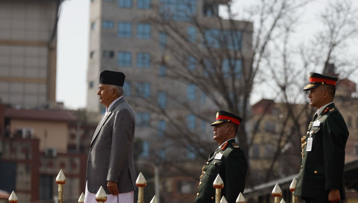 काठमाडौँ । राष्ट्रपति रामचन्द्र पौडेल प्रथम महिला सबिता पौडेलसहित नेपाली सेनाद्वारा घोडेजात्राका अवसरमा बुधबार टुँडिखेलमा आयोजित समारोहमा सहभागी भएका छन् । सो अवसरमा नेपाली सेनाले उनको सम्मानमा सलामी अर्पण गरेको थियो ।