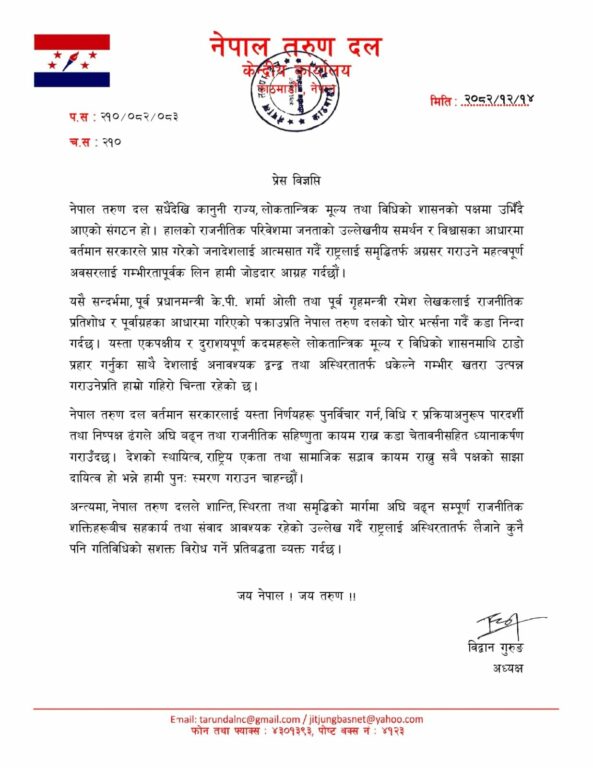 तरुण दलका अध्यक्ष विद्वान गुरुङले आज एक प्रेस विज्ञप्ति जारी गर्दै सरकारको यो कदमले विधिको शासनमाथिको ठाडो प्रहार भन्दै मुलुकलाई गम्भीर अस्थिरतातर्फ धकेल्ने घटना भएको उल्लेख गरेका छन् ।