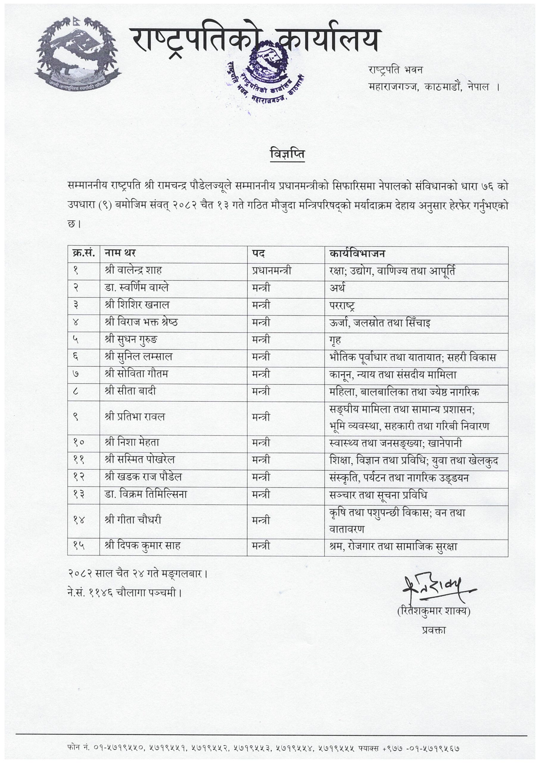 त्यसपछि क्रमशः महिला, बालबालिका तथा ज्येष्ठ नागरिकमन्त्री सीता बादी, संघीय मामिला तथा सामान्य प्रशासन तथा भूमि व्यवस्था, सहकारी तथा गरिबी निवारणमन्त्री प्रतिभा रावल, स्वास्थ्य तथा जनसंख्या तथा खानेपानीमन्त्री निशा मेहता, शिक्षा, विज्ञान तथा प्रविधि तथा युवा तथा खेलकुदमन्त्री सस्मित पोखरेल रहेका छन्।