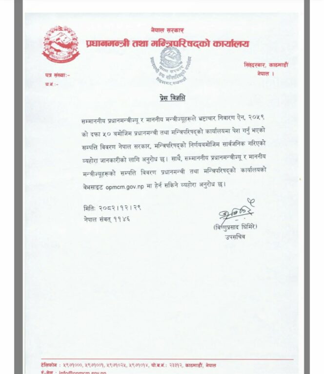उक्त विवरण नेपाल सरकार, मन्त्रिपरिषद्को निर्णयबमोजिम सार्वजनिक गरिएको उपसचिव विष्णुप्रसाद घिमिरेले जारी गरेको विज्ञप्तिमा उल्लेख छ ।