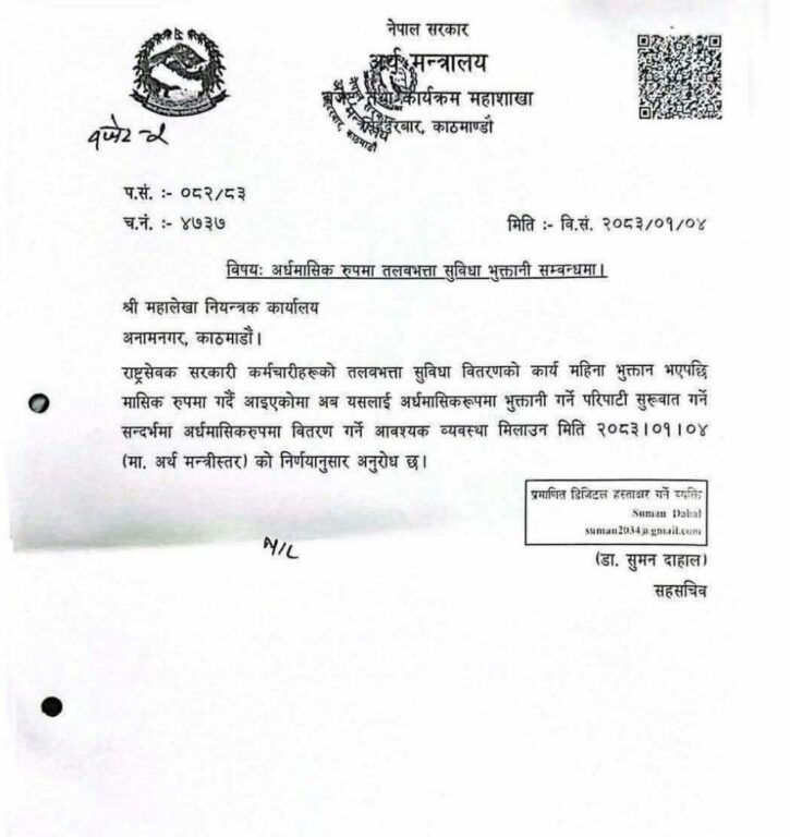 मन्त्रालयबाट जारी पत्रअनुसार यो व्यवस्था कार्यान्वयनका लागि महालेखा नियन्त्रक कार्यालयलाई आवश्यक तयारी गर्न निर्देशन दिइएको छ ।