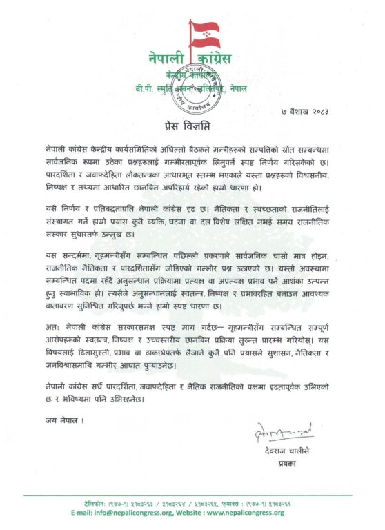 कांग्रेसले छानबिन प्रक्रियामा ढिलासुस्ती, प्रभाव वा ढाकछोपतर्फ लैजाने कुनै पनि प्रयासले सुशासन, नैतिकता र जनविश्वासमा गम्भीर आघात पुर्याउने उल्लेख गरेको छ। पारदर्शिता र जवाफदेहिता लोकतन्त्रका आधारभूत स्तम्भ भएकाले तथ्यमा आधारित छानबिन अपरिहार्य रहेको पार्टीको धारणा छ।