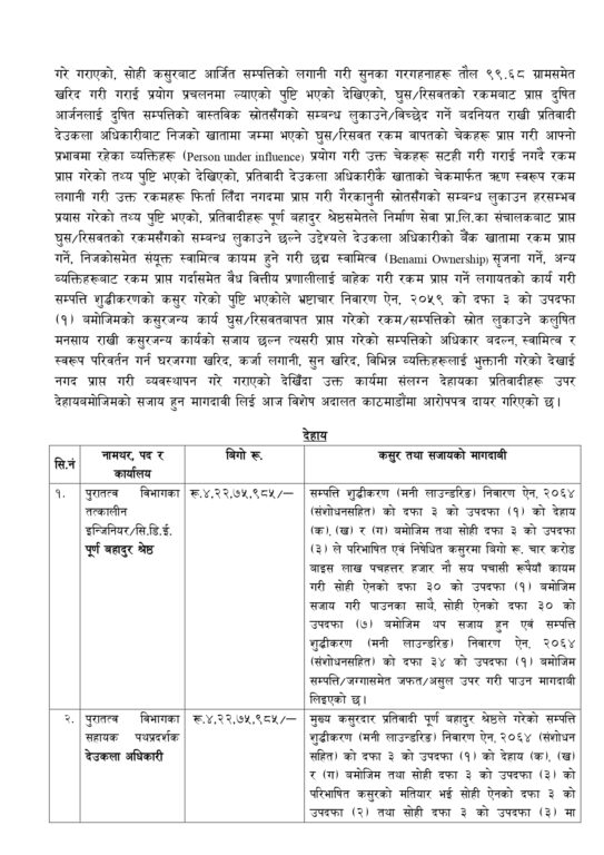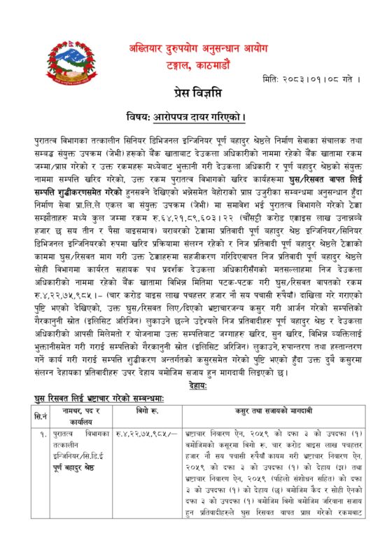 काठमाडौँ । पुरातत्व विभागमा कार्यरत तत्कालीन सिनियर डिभिजनल इन्जिनियर पूर्णबहादुर श्रेष्ठसहित देउकला अधिकारीविरुद्ध अख्तियार दुरुपयोग अनुसन्धान आयोगले भ्रष्टाचार तथा सम्पत्ति शुद्धीकरणसम्बन्धी आरोपपत्र दायर गरेको छ।