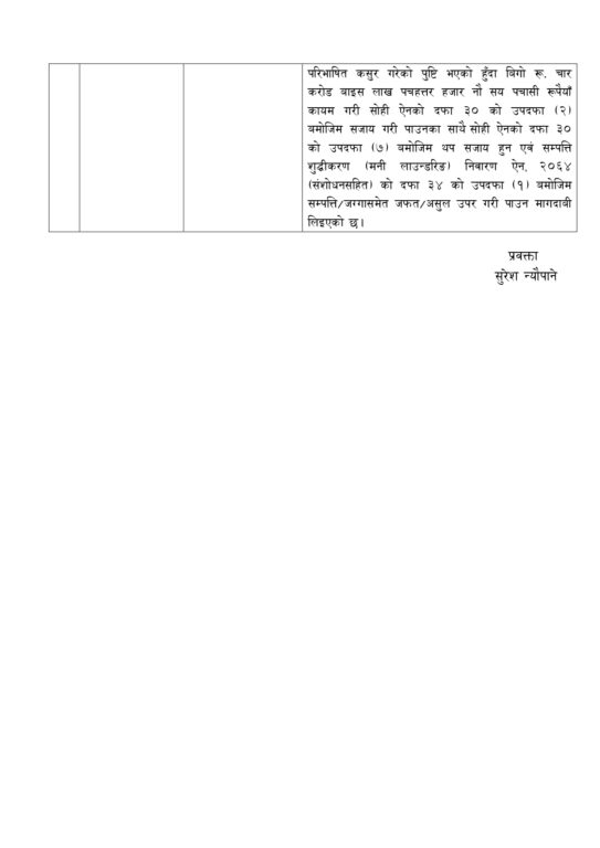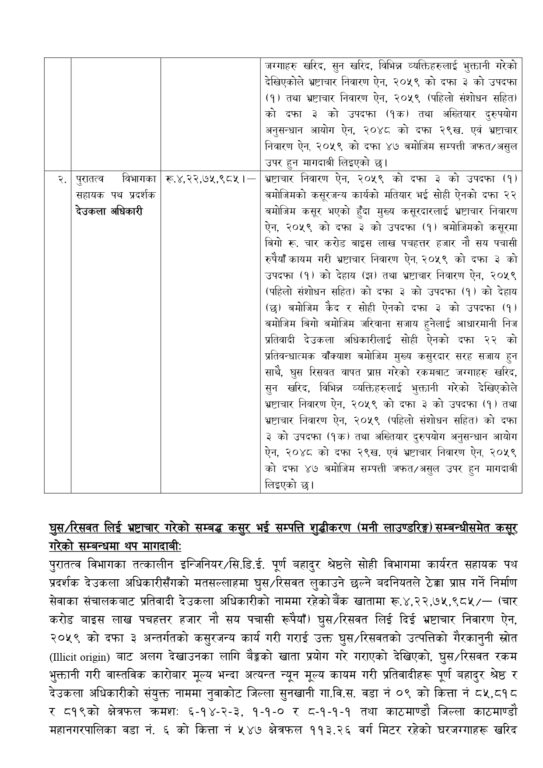 यस आधारमा दुवै प्रतिवादीमाथि भ्रष्टाचार तथा सम्पत्ति शुद्धीकरणसम्बन्धी कानुनी कारबाही र सजायको मागदाबी लिइएको आयोगले जनाएको छ ।