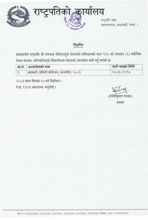 काठमाडौं । राष्ट्रपति रामचन्द्र पौडेलले ‘सहकारी (पहिलो संशोधन) अध्यादेश, २०८३’ जारी गरेका छन् ।