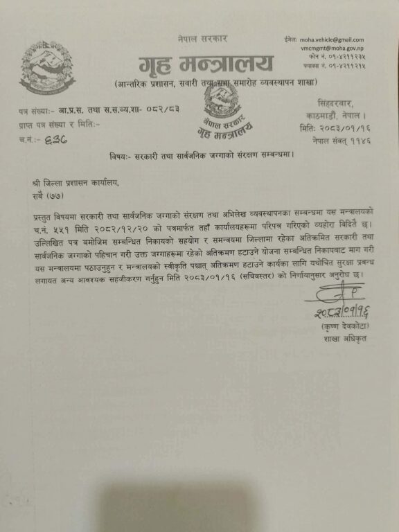 यसअघि २०८२ चैत २० गतेको मन्त्रालायको परिपत्रलाई स्मरण गराउँदै गृहले पुनः जिल्ला प्रशासन कार्यालयहरूलाई अतिक्रमित जग्गा पहिचान र संरक्षणका लागि निर्देशन दिएको हो। मन्त्रालयका शाखा अधिकृत कृष्ण देवकोटाद्वारा हस्ताक्षर गरिएको उक्त पत्रमा जिल्लास्थित सम्बन्धित निकायहरूसँग समन्वय गरी सार्वजनिक जग्गाको पहिचान गर्न र त्यहाँ रहेका अतिक्रमण हटाउने विस्तृत योजना माग गर्न भनिएको छ।