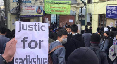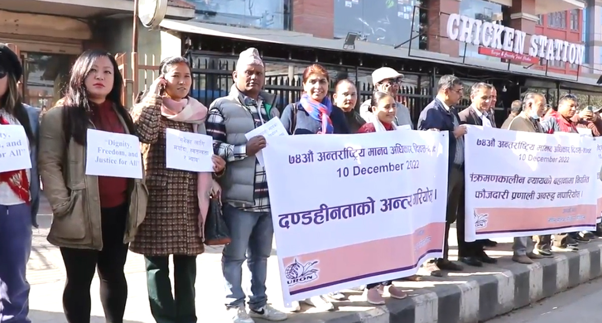 काठमाडौं । ७४ औँ अन्तर्राष्ट्रिय मानव अधिकार दिवसको पूर्वसन्ध्यामा दण्डहिनताको अन्त्यको माग गर्दै माइतीघरमा प्रदर्शन गरिएको छ । नेपाल मानव अधिकार संगठनको आयोजनामा न्यायापालिकालाई राजनीतिक हस्तक्षेप मुक्त बनाउनु पर्ने माग राख्दै शुक्रबार प्रदर्शन गरिएको हो । सबैका लागि मर्यादा, स्वतन्त्रता