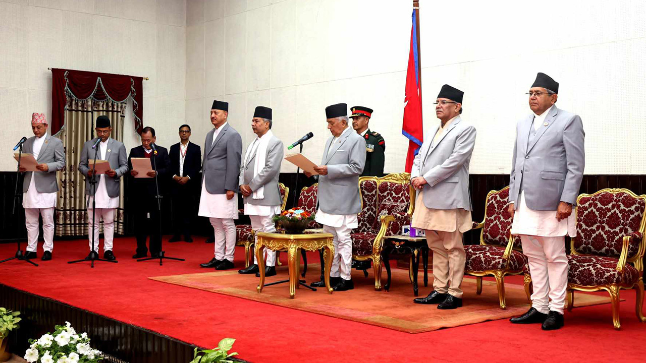 काठमाडौं । प्रधानमन्त्री पुष्पकमल दाहाल ‘प्रचण्ड’ले मन्त्रिमण्डल पुनर्गठन गरेका छन्। सोमबार नवनियुक्त मन्त्रीहरुको सपथ ग्रहण भएको छ । राष्ट्रपति रामचन्द्र पौडेलले नवनियुक्त मन्त्रीहरुको सपथ गराउनुभएको हो । पौडेलले विना विभागिय मन्त्रीहरुका रुपमा एमालेबाट पदम गिरी, माओवादी केन्द्रबाट हितबहादुर तामाङ र