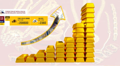 काठमाडौं । तिहार बिदापछि आइतबारदेखि खुलेको बजारमा सुनको मूल्य एकैदिन ११ हजार ६ सय रुपैयाँले घटेको छ । नेपाल सुनचाँदी व्यवसायी महासंघका अनुसार, आइतबार सुनको मूल्य घटेर प्रति तोला २ लाख ४१ हजार ९ सय रुपैयाँ कायम भएको हो ।